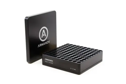 Nábojový kalibr Armanov na 100 ks nábojů pro rychlé vyhledávání deformovaných nábojů ráže 9x21mm. Černá barva. Součástí je i plastový přepravní kufr a čistící utěrka.