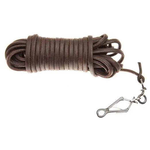 Hnědá barvářská šňůra z oválné 6mm silné kůže ukončená klešťovou karabinou. Délka 8 metrů.