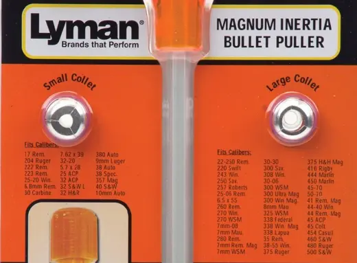 Delaborační kladívko Lyman MAGNUM INERTIA BULLET PULLER zanechá střelu i nábojnici ve stavu, který umožní jejich další použití. Dvě výměnné kleštiny umožní delaboraci od ráže 5,7 X 28 až po nějvětší Magnum.