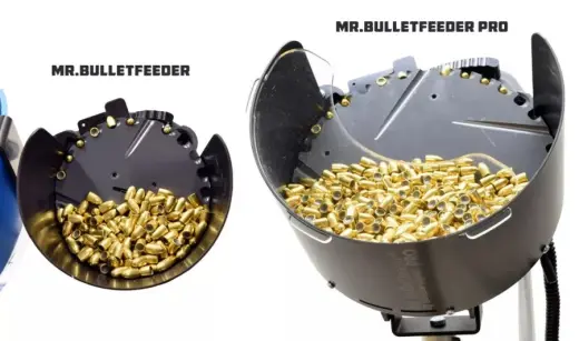 Elektrický podavač střel Mr. Bulletfeeder PRO pro ráži .45 ACP, .44 Special, .44 Magnum. Mnohem větší násypka pojme až trojnásobnou kapacitu (např. více než 1000 střel ráže 9mm 124 gr, 7200 ks/hod.).