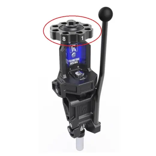 Náhradní nástrojová hlava s osmi pozicemi pro matrice je určená pro robustní přebíjecí lis Frankford Arsenal Precision Turret Press.