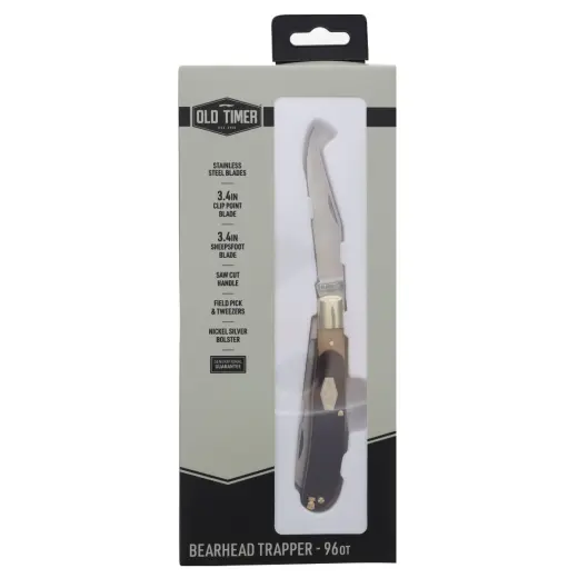 Old Timer Bearhead Trapper 96OT je praktický dvoučepelový zavírací nůž, který kombinuje tradiční design s moderní funkčností. Obě čepele – Clip Point a Sheepsfoot – jsou vyrobeny z vysoce uhlíkové nerezové oceli a mají délku 8,6 cm. Poskytují všestranné využití jak pro každodenní úkoly, tak pro lehké práce v přírodě.