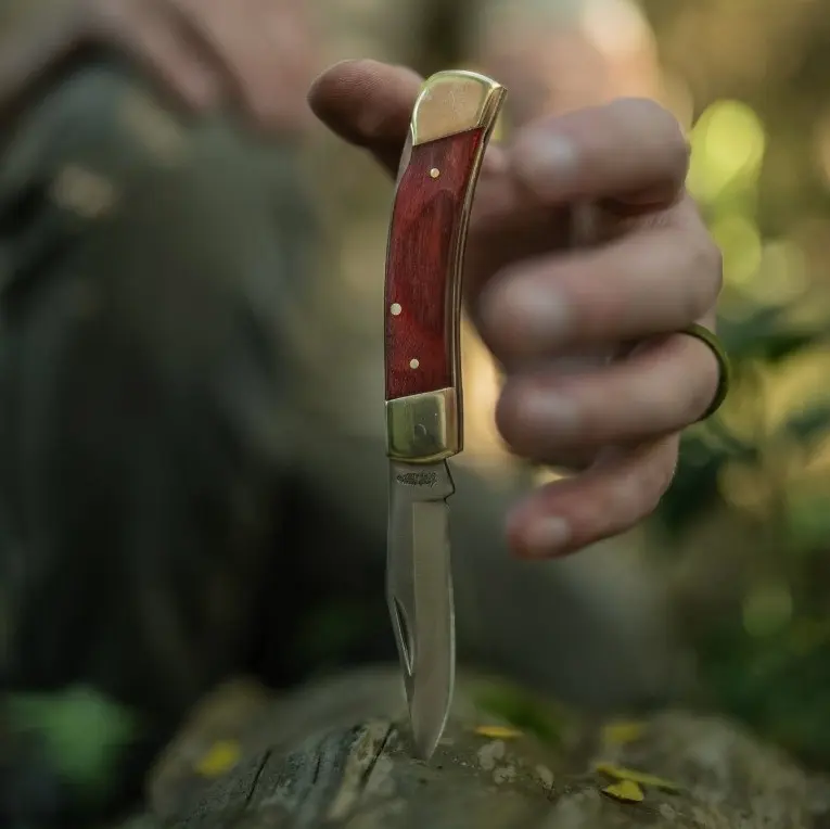 Rukojeť z přírodního dřeva má ergonomický tvar, elegantní nýty a niklové bolsterky, které zvyšují stabilitu a dodávají noži klasický vzhled. Pojistka typu lockback brání nechtěnému zavření čepele během používání. Pro snadné otevírání je čepel vybavena zářezem pro nehet (nail pull).
