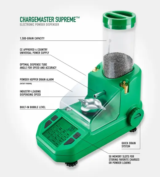 RCBS ChargeMaster Supreme Powder Dispenser nabízí přesnost +/-0,1 grainu, připojení Bluetooth pro přizpůsobení a zefektivnění dávkovacích procesů a zabudovaný patentovaný učící proces „Powder Learn Process“.