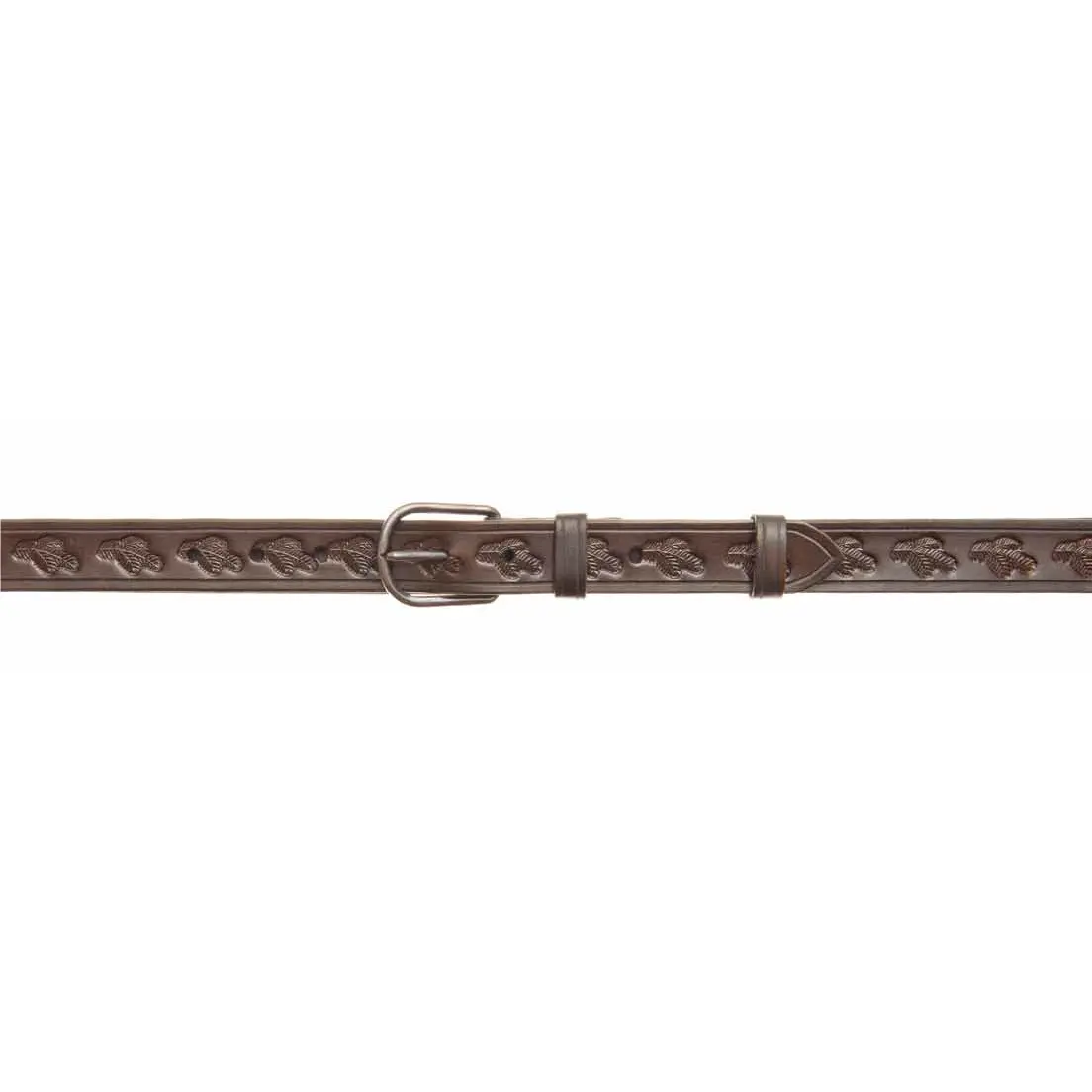 Hnědý myslivecký opasek z kvalitní kůže, zdobený mysliveckými motivy. Šířka 3 cm, délka 140 cm.