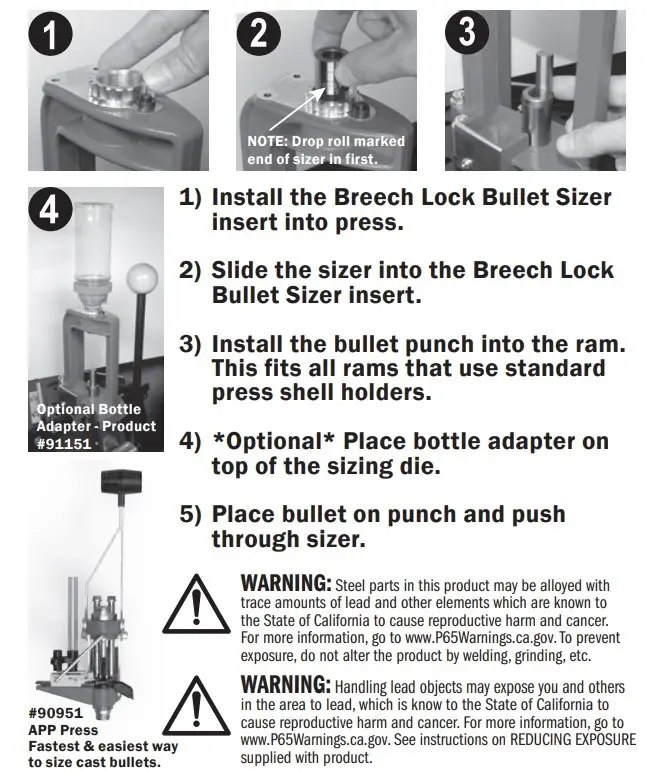 Pro použivání kalibrační sady Bullet Sizer & Punch Set je nutné vlastnit univerzální matrici Breech Lock Bullet Sizer Kit, do které se kalibr (tzv. Sizer) vkládá. Set byl navržen speciálně pro lis Lee Automatic Processing Press (APP), je však vhodný pro jakýkoliv jednooperační lis s rychlovýměnnými vložkami Breech Lock.