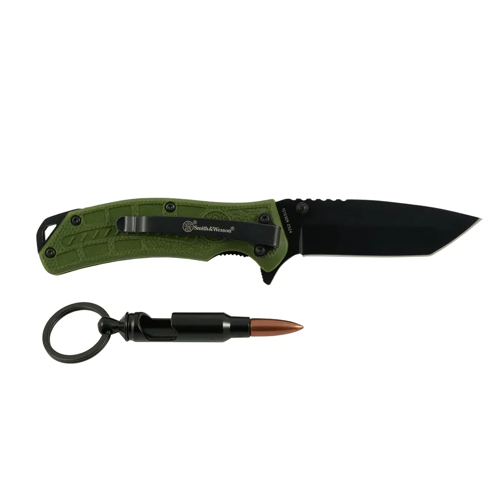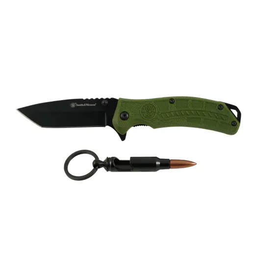 Taktický kapesní nůž s čepelí Tanto z nerezové oceli, asistovaným pružinovým otevíráním a pojistkou Liner Lock. Jako dárek přívěšek na klíče ve tvaru náboje, sloužící jako otvírák na lahve.