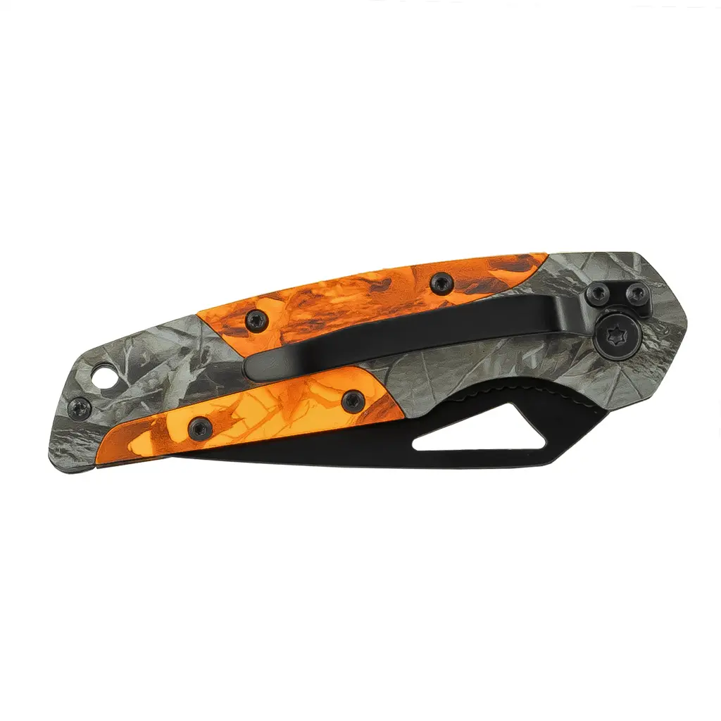 Kapesní zavírací nůž pro každodenní použití je vybaven Clip Point čepelí z nerezové oceli s černou oxidovou úpravou a pojistkou Liner Lock. Stylová Camo rukojeť s reflexními oranžovými prvky.