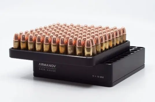 Nábojový kalibr Armanov na 100 ks nábojů pro rychlé vyhledávání deformovaných nábojů ráže .40 S&W. Součástí je i plastový přepravní kufr a čistící utěrka.