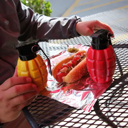 Dávkovače kečupu a hořčice Caliber Gourmet přinášejí zábavu i funkčnost na každý stůl. Jsou navrženy tak, aby vypadaly jako granáty. Stačí odklopit víčko, stisknout „granát“ a vaše oblíbená omáčka je hned připravená k podávání.