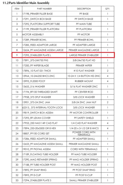 Stabilizer Plate L (#17295). Originální náhradní díl č.9 pro automatický plnič zápalek Dillon RF-100 Primer Filler LG (určený pro velké zápalky.)