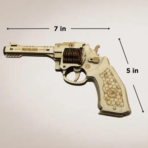 3D dřevěný model pistole se střílením na gumičky Ruber Band Revolver Puzzle Wood. Dřevěná skládačka vhodná pro děti i dospělé. Plně funkční - bezpečně střílí gumičkami.