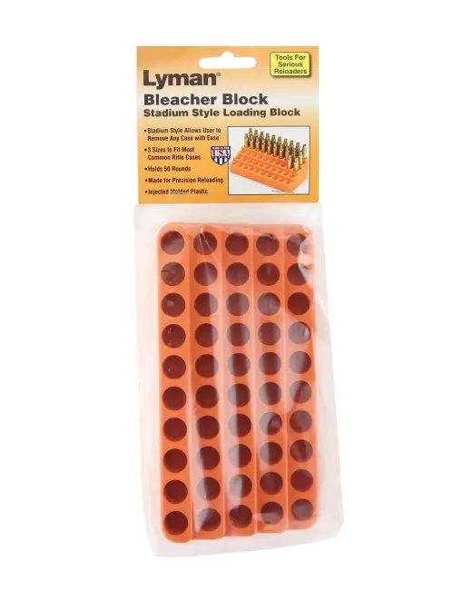 Oproti jiným řešením obdobných držáků nábojnic, zabírá Lyman Bleacher Block méně prostoru na stole, při zachování výborné dostupnosti nábojnic. Tyto tribunové držáky mají kapacitu 50 nábojnic a jsou dostupné ve pěti variantách dle rozměrů nábojnic, které tvoří skvělý kompromis univerzálního použití a přesného vedení nábojnic.