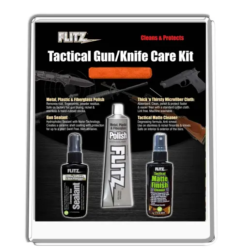 V reakci na převládající trend na trhu, který směřuje k taktickým a matným povrchovým úpravám čepelí a střelných zbraní, představuje společnost Flitz sadu pro péči o taktické zbraně a nože. V jedné praktické sadě připravené k použití najdete vše, co potřebujete k udržení čistoty a ochraně střelných zbraní i čepelí.