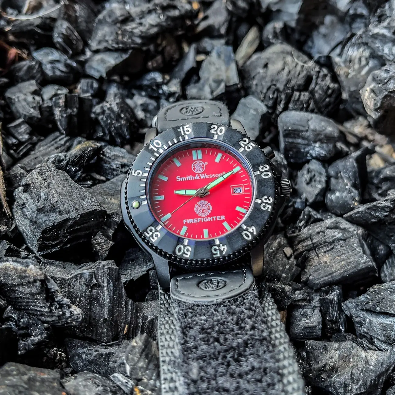 Smith & Wesson Fire Fighter Watch. Tělo z nerezové oceli, otočná luneta, červený ciferník s logem hasičů, datumový display, elektronické podsvícení, voděodolnost. 3ATM, nylonový řemínek. Rozměr: 40 x 13 mm.
