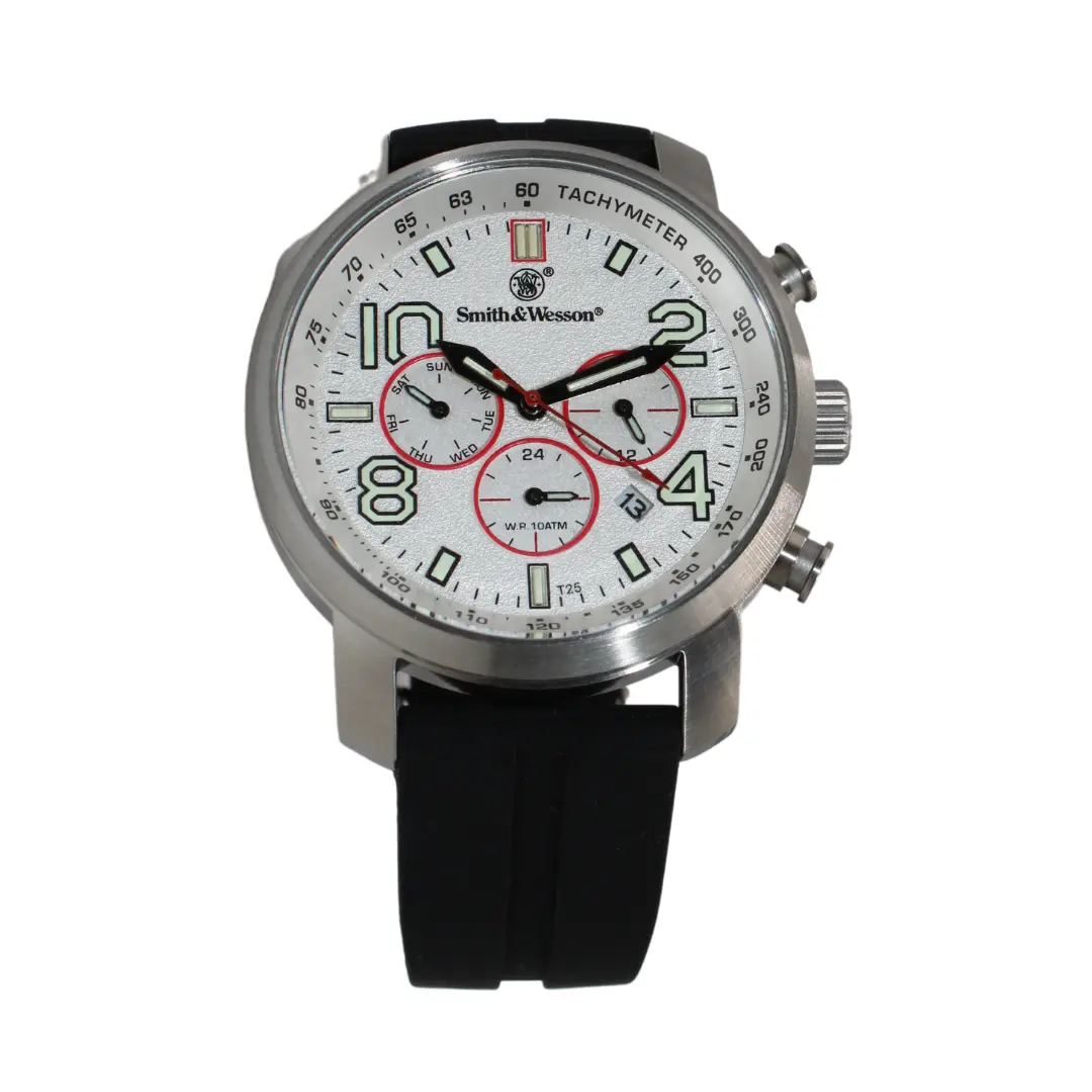 White Smith & Wesson Tritium Chronograph Red. Tělo z nerezové oceli, otočná luneta, tachymetrická stupnice, datumový display, tritiové podsvícení, voděodolnost 10ATM, silikonový řemínek, rozměr 45 x 13 mm.