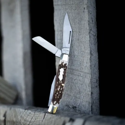 Tradiční kapesní zavírací nůž se třemi čepelemi z nerezové oceli a rukojetí Staglon s elegantními niklovými bolsterky. Ideální pro každodenní nošení, práci i lov. Celková délka 17,5 cm, hmotnost 80 g.