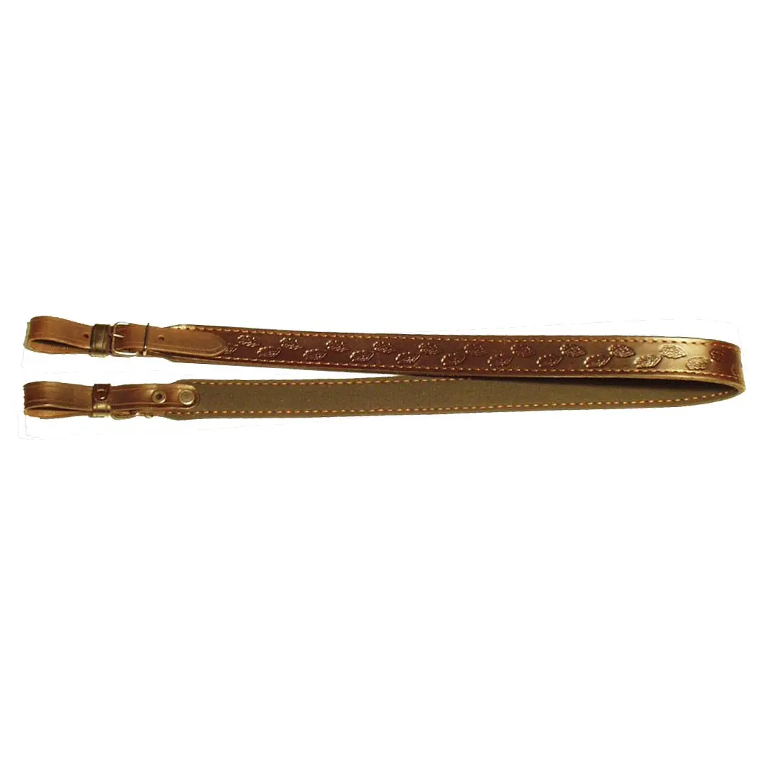 Kvalitní kožený řemen na pušku podšitý protiskluzovou gumou a zdobený mysliveckými motivy. Délkově nastavitelné zapínání na přezku.