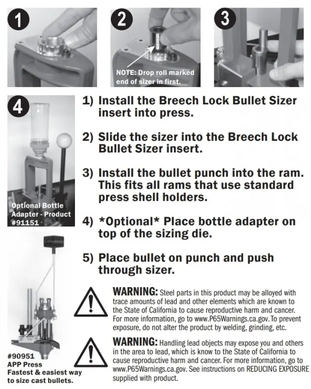Pro použivání kalibrační sady Bullet Sizer & Punch Set je nutné vlastnit univerzální matrici Breech Lock Bullet Sizer Kit, do které se kalibr (tzv. Sizer) vkládá. Set byl navržen speciálně pro lis Lee Automatic Processing Press (APP), je však vhodný pro jakýkoliv jednooperační lis s rychlovýměnnými vložkami Breech Lock.