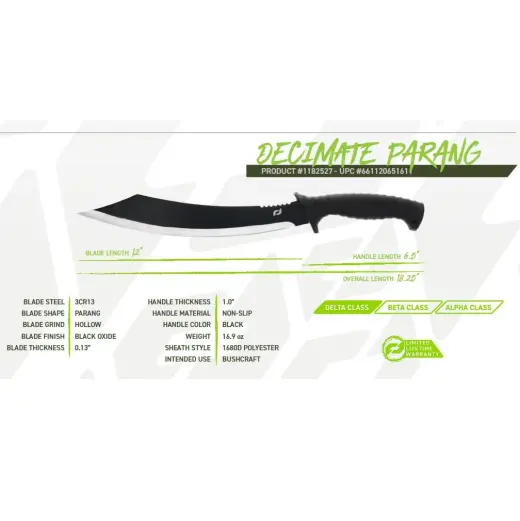 Schrade Decimate Parang je robustní mačeta navržená v Columbii (Missouri, USA), která zvládne i ty nejnáročnější úkoly v terénu – od prosekávání hustého porostu až po přípravu dřeva na tábořišti. Díky odolné konstrukci je ideálním nástrojem pro bushcraft a outdoor.