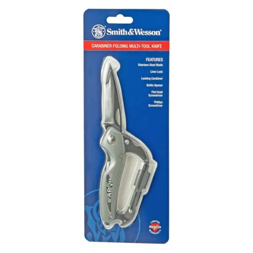 Multifunkční nůž od společnosti Smith&Wesson je spolehlivý zavírací nůž s unikátní karabinou pro zavěšení nože, hrotem pro rozbíjení skla a plochým a křížovým šroubovákem. Karabina navíc slouží jako otvírák na lahve.