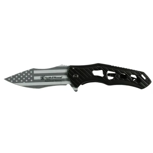 Tenký zavírací nůž v moderním skeletonovém provedení s laserem gravírovanou čepelí s motivem americké vlajky, logem a nápisem Smith&Wesson America’s Heroes. Čepel je vyrobena z vysokouhlíkové nerezové oceli 3Cr13, která je známá vysokou pevností, tvrdostí, odolností proti korozi a dobrou brousitelností. Čepel lze jednoduše otevřít jednou rukou pomocí Flipperu.