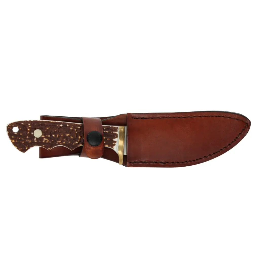 Nůž s čepelí Skinner (11,7 cm) ideální na stahování kůže, porcování i univerzální outdoorové použití. Rukojeť Staglon s drážkami, mosazná záštita. Včetně koženého pouzdra. Celková délka 23 cm, 221 g.