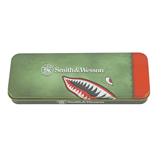 Nůž je dodáván ve stylové plechové krabičce Smith&Wesson s originálním designem amerického stíhacího letounu, takže se skvěle hodí jako dárek.