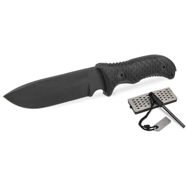 Kvalitní nůž Schrade Frontier s práškovanou čepelí. Včetně pouzdra, diamantového brousku a křesadla. Vysokouhlíková ocel 1095. Schrade.