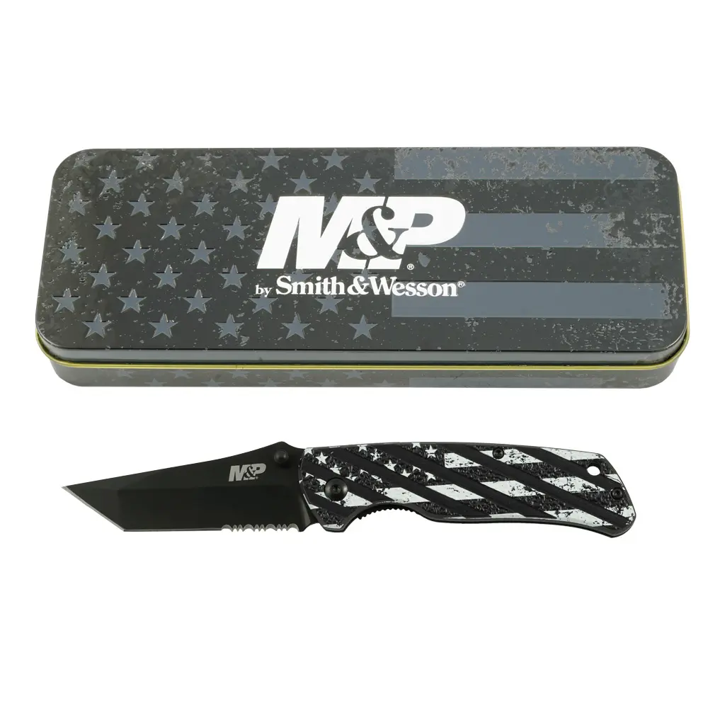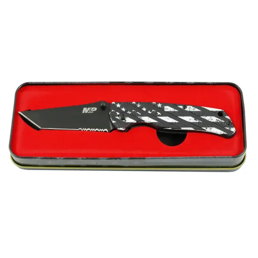 Zavírací nůž M&P American Patriot od společnosti Smith&Wesson je malý kapesní nůž, určený ke každodennímu nošení. Je vybavený kvalitní čepelí typu Tanto z vysokouhlíkové nerezové oceli 3Cr13, která je známá vysokou pevností, tvrdostí, odolností proti korozi a dobrou brousitelností. Čepel s částečně vroubkovaným ostřím disponuje kolíčkem pro snadné otevírání nože jednou rukou. Černěná čepel poskytuje dodatečnou trvanlivost, odolnost proti korozi a zabraňuje odleskům.