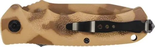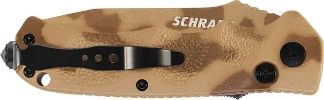 Kvalitní zavírací nůž značky Schrade s tlačítkovou pojistkou. Čepel je vyrobena z vysoce uhlíkaté nerezové oceli 4116. Rukojeť a čepel jsou opatřeny povrchovou úpravou se vzorem pouštního maskování (Desert Camo).