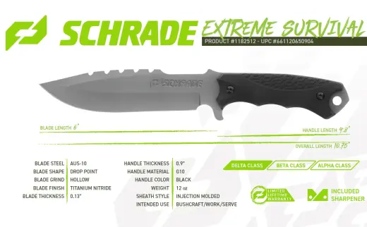 Schrade Extreme Survival Fixed Blade, ze třídy Schrade Delta, ztělesňuje robustní a spolehlivý nůž s bezkonkurenční přesností, odolností a špičkovým designem, který od značky Schrade očekáváte.