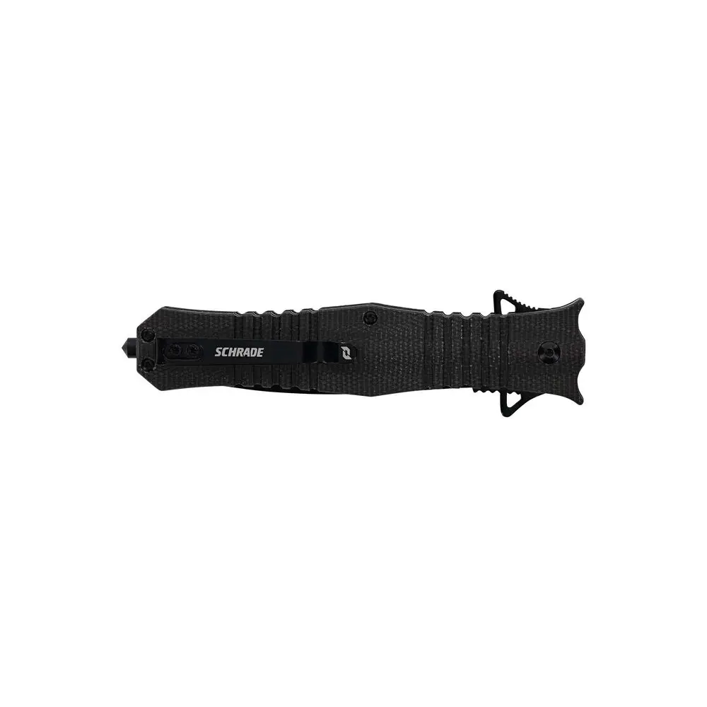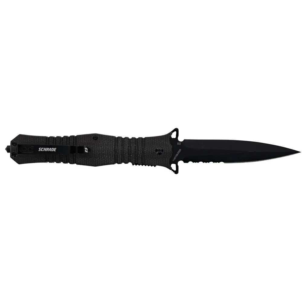 Zavírací nůž Schrade ve tvaru dýky s rukojetí z vysoce odolného materiálu Micarta. Nůž je vybaven klipem na opasek a hrotem na rozbíjení skla.