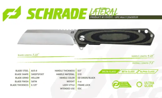 Nůž Schrade Lateral Folder ze třídy Schrade Delta ztělesňuje bezkonkurenční přesnost, spolehlivost a špičkový design, které od značky Schrade očekáváte. Tento dobře vypadající nůž ve stylu sekáčku je vybaven čepelí z kvalitní nerezové oceli AUS-8 a slavnou technologií UltraGlide. Nůž Lateral je dostatečně bytelný pro použití, ale zároveň dostatečně štíhlý, aby zmizel v kapse.
