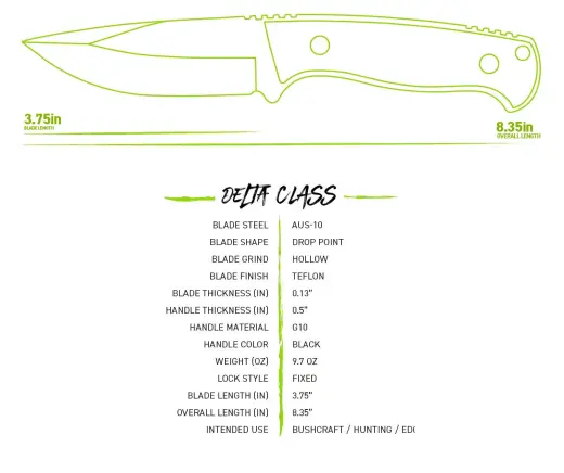 Čepel nože, ve tvaru Drop point, je vyrobena z velmi kvalitní a odolné nerezové oceli AUS-10 s teflonovou povrchovou úpravou. Poskytuje žádoucí rovnováhu mezi ostrostí, funkčností a zachováním ostří. Rukojeť, z velmi odolného materiálu G10, má protiskluzovou texturu, která zajišťuje pevný úchop. Na konci rukojeti je otvor pro zavěšení.