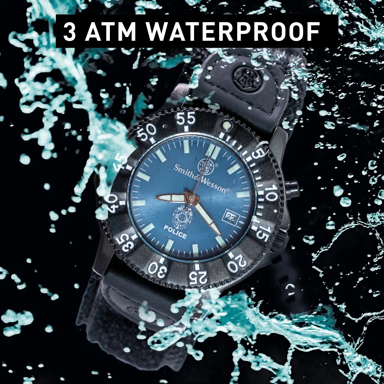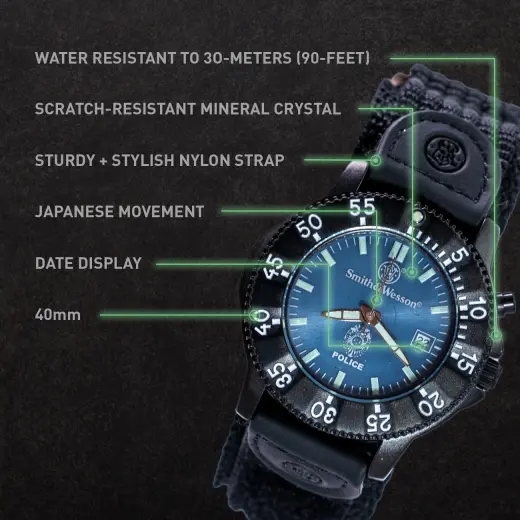 Smith & Wesson Police Watch. Tělo z nerezové oceli, otočná luneta, modrý ciferník s logem policie, datumový display, elektronické podsvícení, 3ATM, nylonový řemínek. Rozměr: 40 x 13 mm.