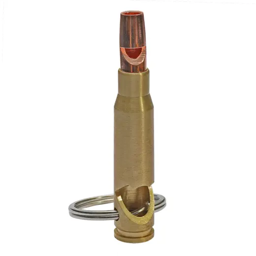 Působivý přívěšek na klíče značky Caliber Gourmet vyrobený z pravé nábojnice a doplněný o praktický otvírák na lahve a píšťalku, které se hodí mít vždy u sebe.