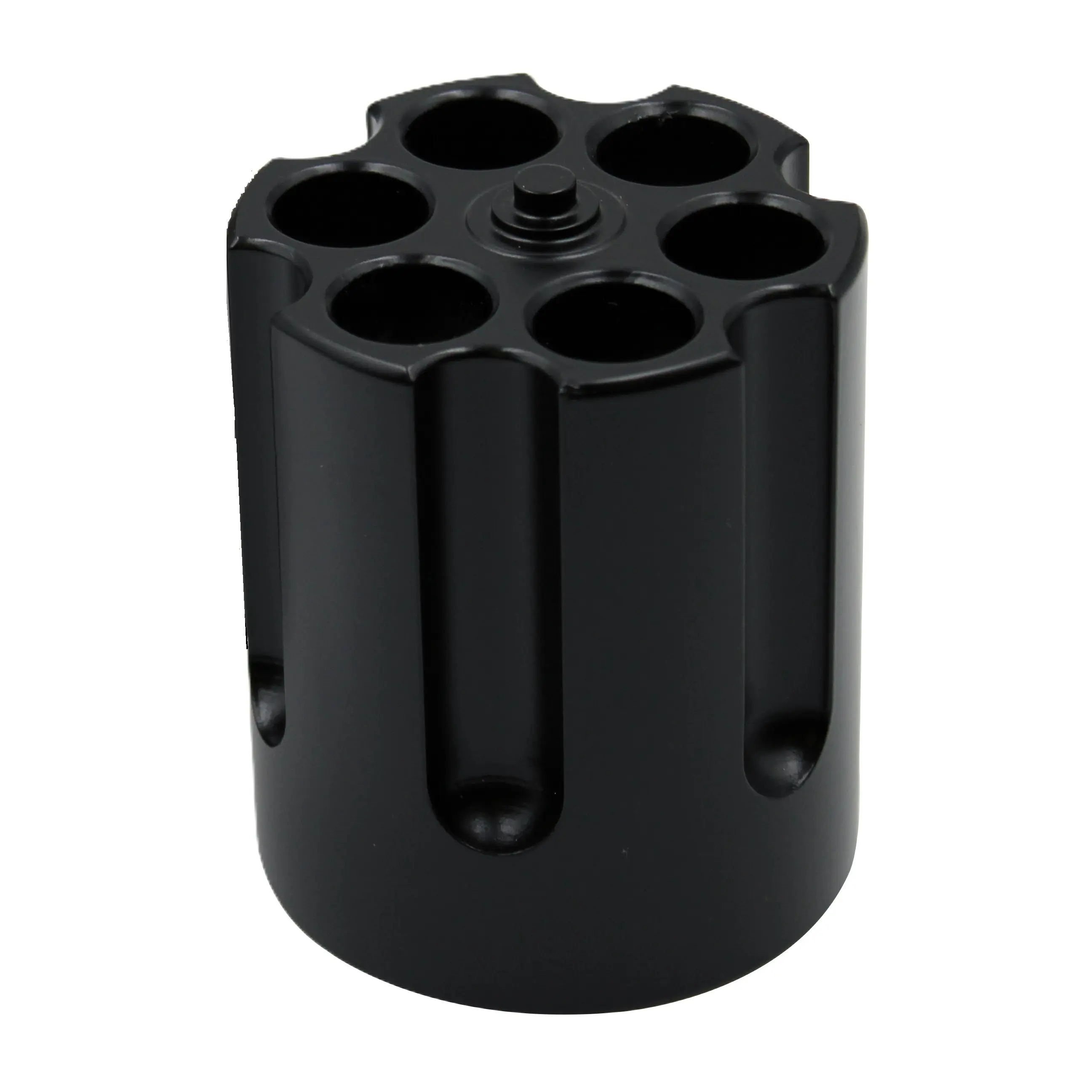 Stojánek na psací potřeby je originální doplněk pro každého, kdo si potrpí na netradiční design a pořádek na pracovním stole. Je těžký, vyrobený z masivního bloku kovu a v elegantním černém provedení připomíná bubínek revolveru. Pojme až šest per, tužek nebo jiných psacích potřeb.