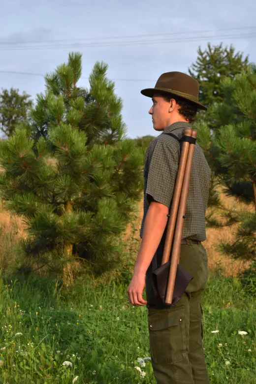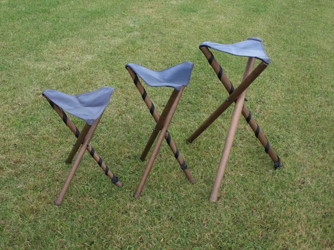 Malá třínohá stolička ze dřeva se sedátkem ze silné kůže. Popruh pro pohodlné přenášení. Výška sedu 50 cm.