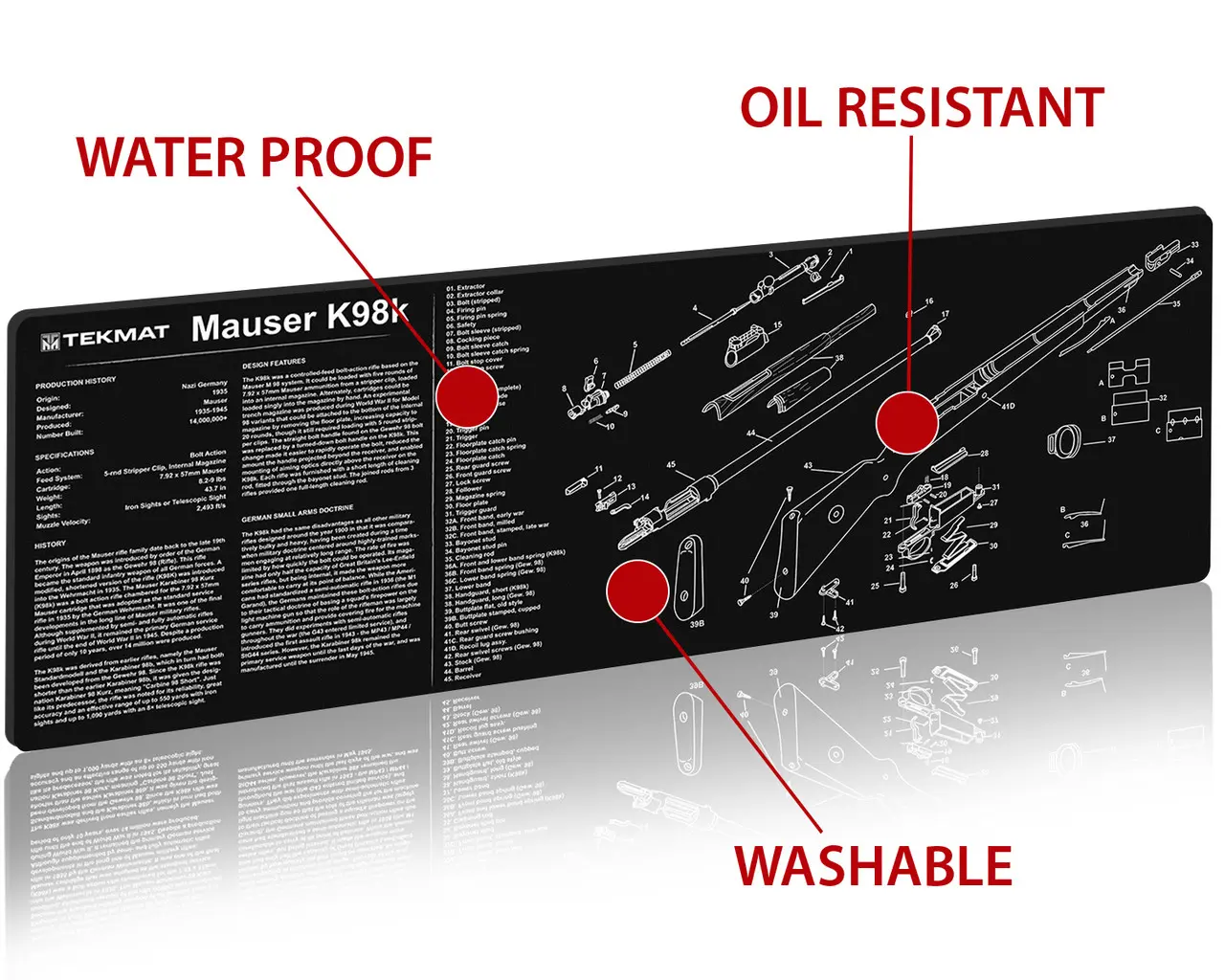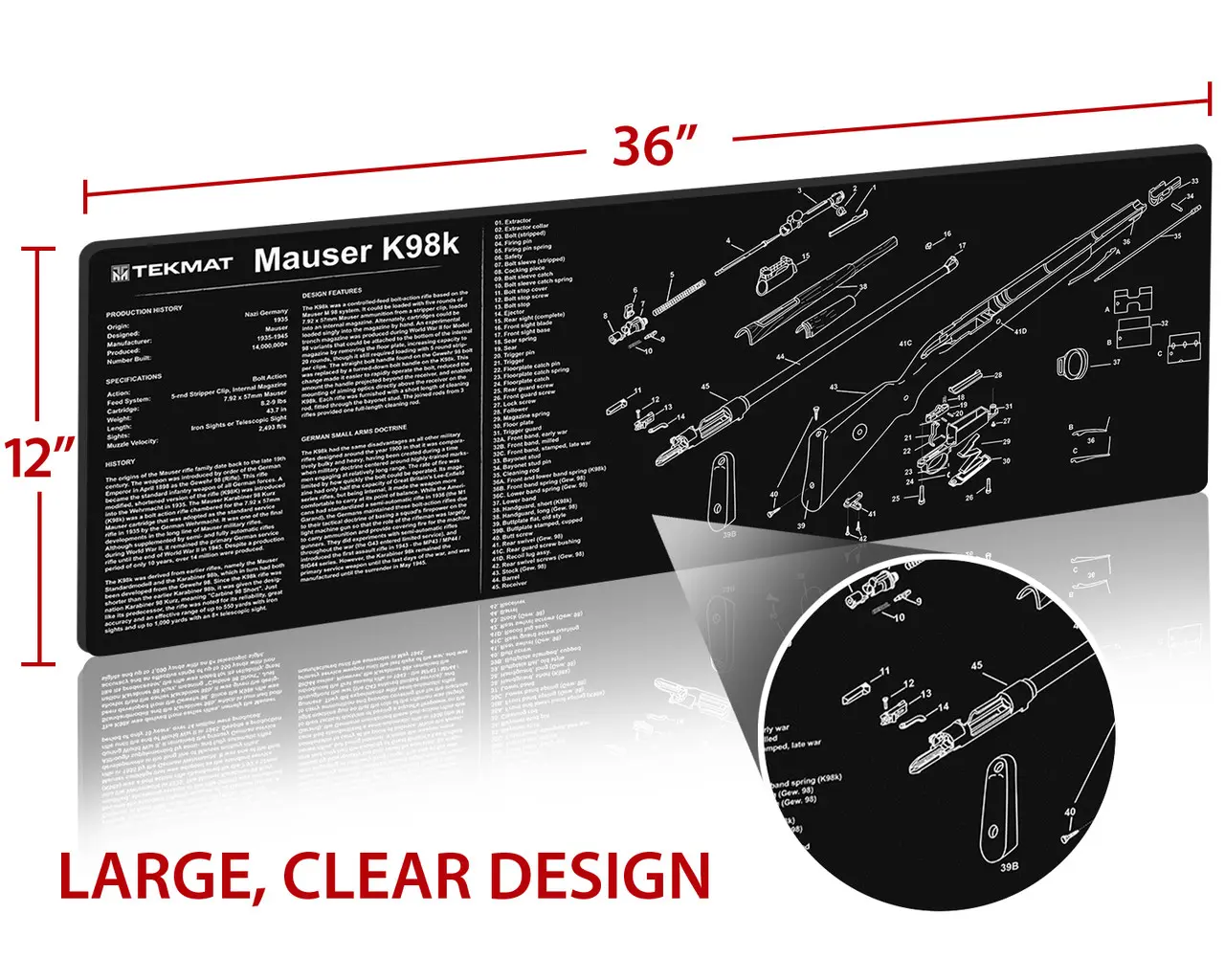 TekMat podložka pro čištění a údržbu zbraní s potiskem modelu Mauser K98.Tyto 36" (91cm) podložky TekMat jsou dostatečně velké, aby se na ně vešla plně rozebraná puška a zbylo místo na nářadí a příslušenství.