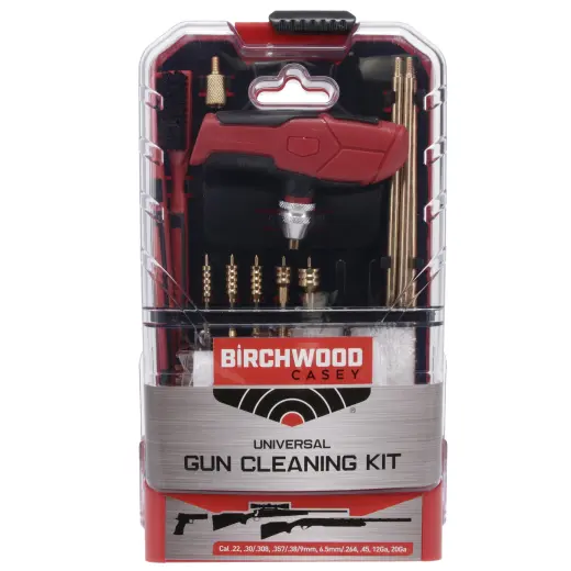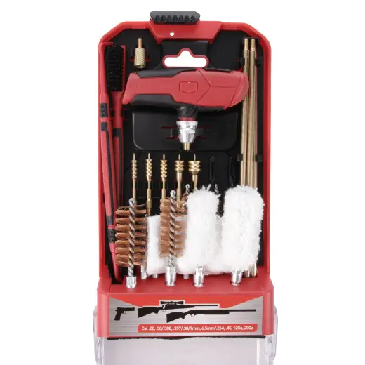 22dílná univerzální sada na čištění zbraní (ráže .22 cal, .243cal, .27/.28 cal, 6mm/.264 cal, .30/.308; 12ga, 20ga). Prakticky uspořádaná ve výklopné úložné krabičce.