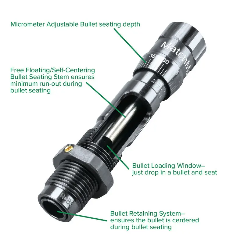 Matrice Matchmaster se od ostatních liší přítomností okénka pro usazení střely a systémem pro její uchycení. Jednoduše vložíte střelu do okénka a zvednete nábojnici do matrice, aby se střela usadila. Vnitřní objímka zachytí a udrží střelu v dokonalé souososti s nábojnicí a zajistí tak její přesné usazení.