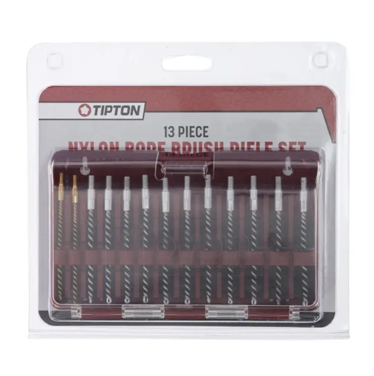 Profesionální 13dílná sada nylonových kartáčků Tipton pro čištění pušek v rážích .17 až .45. Kalibrově přesné kartáčky v pevné krabičce pro důkladné a šetrné čištění vývrtu hlavně.