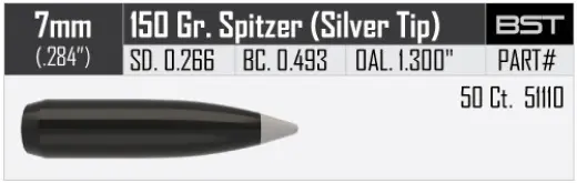 Střela Nosler Ballistic Silvertip 7mm, dia .284, 150grs (9,7g). SKU: 51110