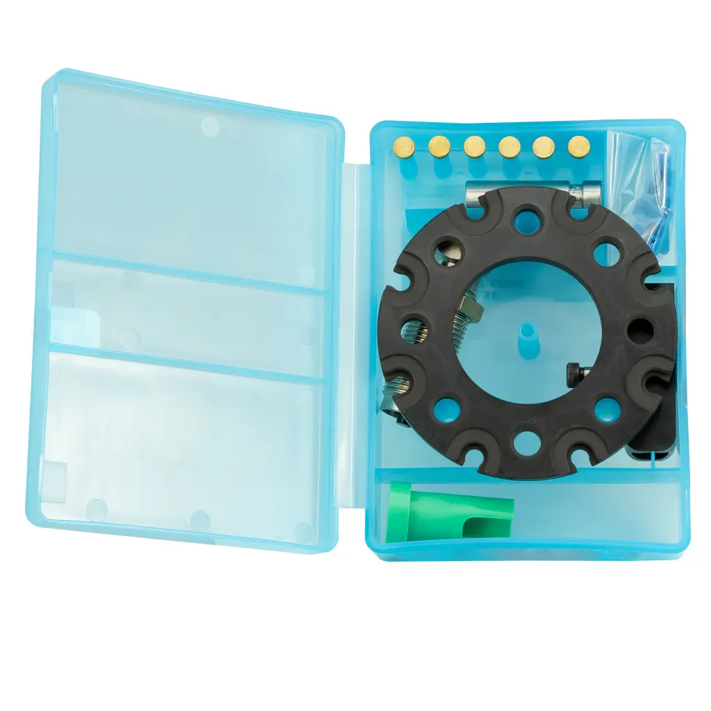 Sada pro výměnu ráží lisu. Obsahuje Shellpate (držák nábojnic), prachovací matrici a další potřebné díly, upravené pro zvolenou ráži.