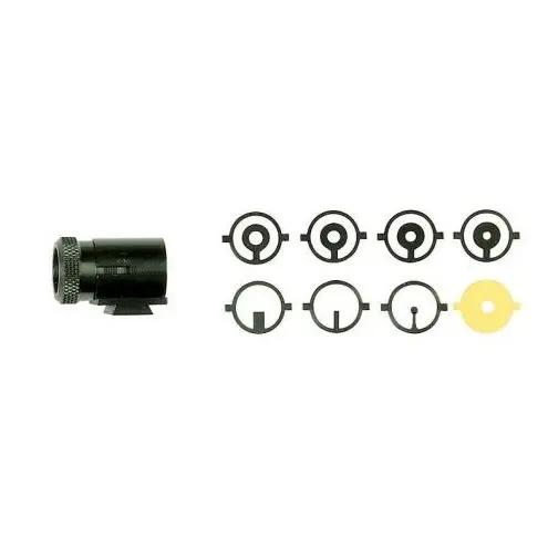 Součástí balení je sada 8 výměnných vložek. Sada obsahuje dvě sloupkové vložky (.050 a .100″), jednu vložku s perlovým bodem (.062″) a pět otvorových vložek (jedna plastová s otvorem .120″ a čtyři ocelové s otvory .093, .102, .110 a .120″).