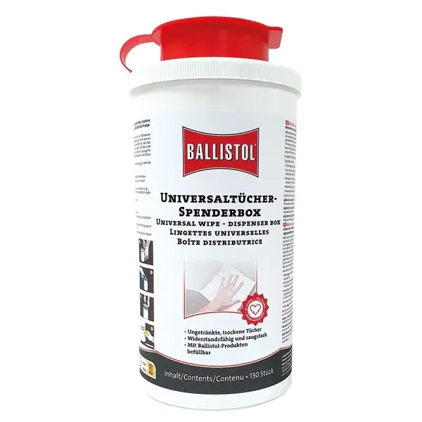 Dávkovací box je opakovaně použitelný a lze jej kdykoli znovu naplnit univerzálními suchými ubrousky Ballistol. Box lze podle potřeby naplnit tekutými výrobky Ballistol, např. dezinfekčním prostředkem na ruce, univerzálním olejem nebo čisticí kapalinou. Namočené ubrousky lze použít k čištění a péči o jakýkoli povrch.
