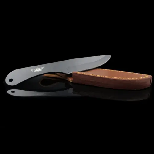 Sada tří vrhacích nožů UZI z nerezové oceli s černou povrchovou úpravou a designovým koženým pouzdrem s poutkem na opasek. Perfektně vyvážené pro přesné vrhání. Délka nožů: 21 cm.